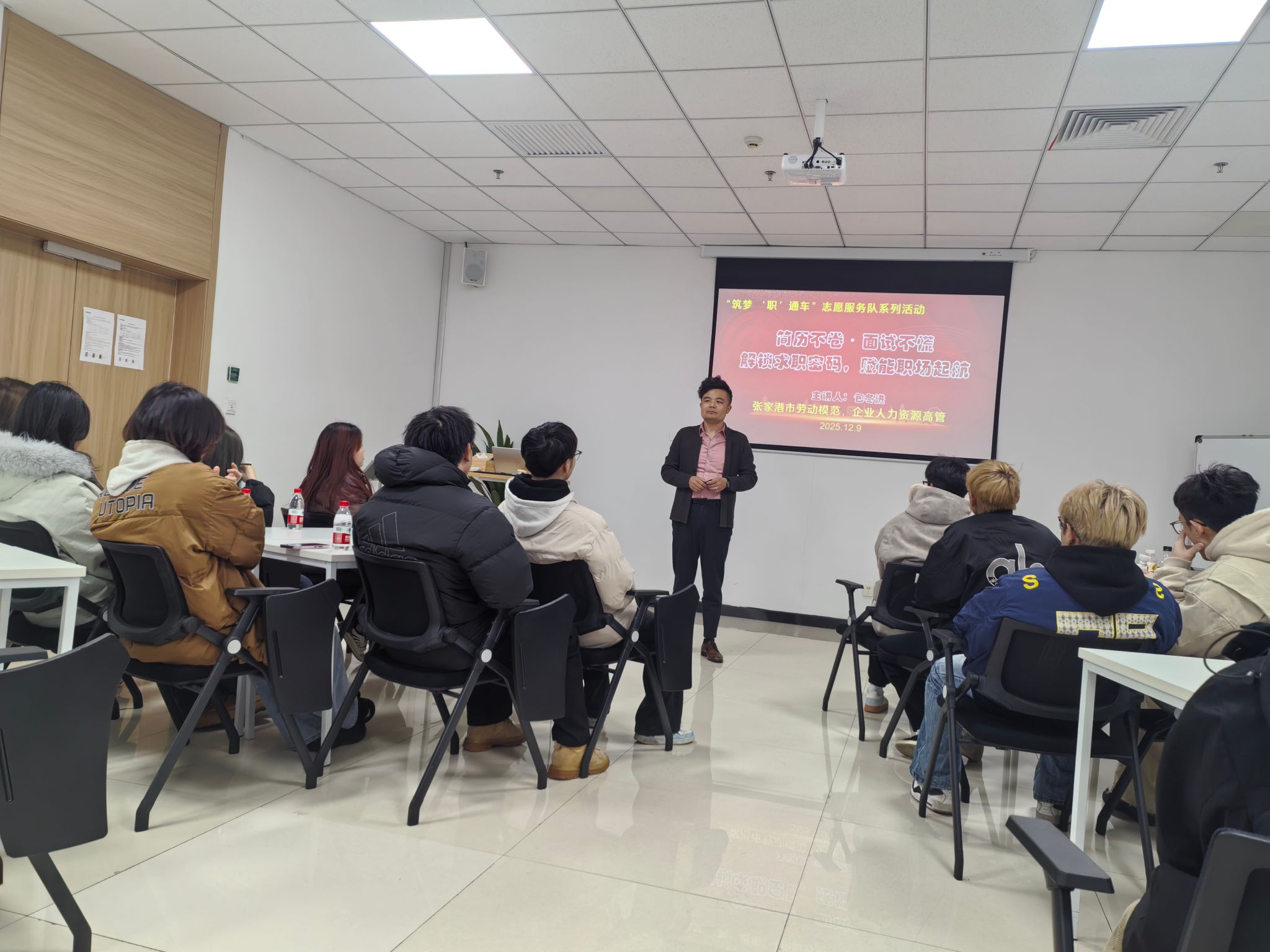 12月9日下午,张家港市劳动模范、企业人力资源经理包冬进在光束汽车会议室为我校师生带来一场求职讲座。围绕“简历不卷·面试不慌——解锁求职密码 赋能职场起航”这一主题,包冬进分享了职业愿景塑造、简历亮点提炼、面试实战演练、职场能力定义等内容,引导学生建立清晰的职业目标,掌握简历撰写的核心技巧,并通过场景模拟提升面试应对能力,重新解读了新时代所需的职场核心竞争力。讲座内容翔实、互动深刻,为学生提供了系统的求职指导与实操方法,有效缓解了学生面对就业市场的焦虑,增强了职场启航的信心与底气,也搭建了校企交流的桥梁,切实赋能学子职业发展。