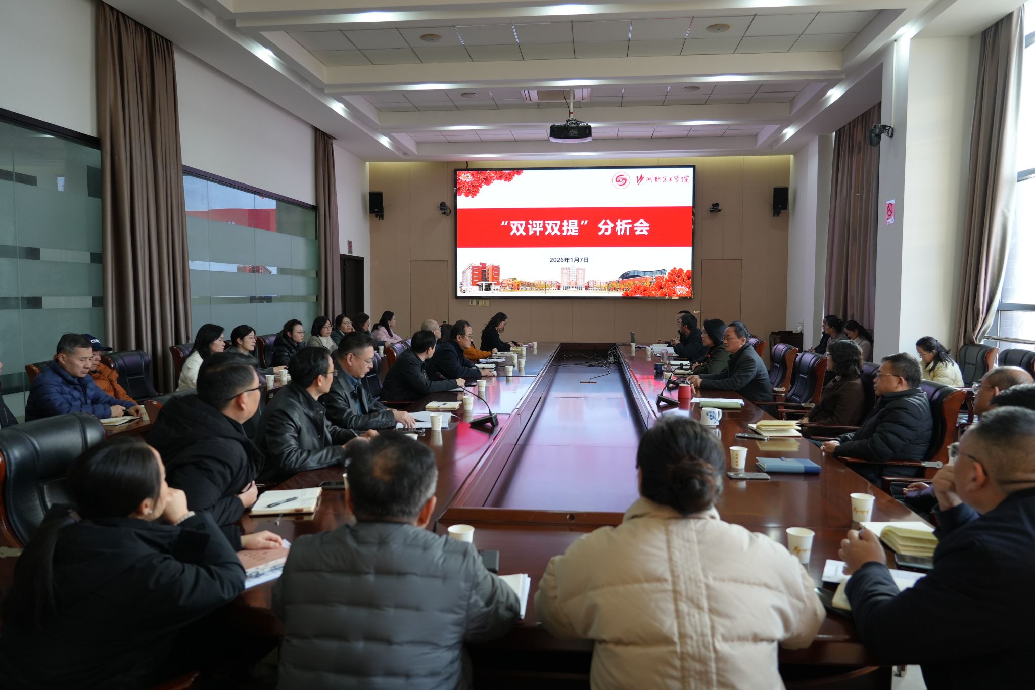 1月7日下午,我校召开2025年度“双评双提”分析会,全体中层以上干部参加。会议通报了2025年度“双评双提”活动开展情况和评测结果。会议指出,这次活动师生参与度高,较为客观地反映了师生对学校教学管理的满意度。要把“双评双提”作为倾听师生心声、改进作风的重要举措,对师生反映的意见建议,要充分调研、及时反馈、扎实整改,持续提升管理服务和育人水平。要以责任担当落实工作,以特色优势提升质量,以过硬作风提质增效,结合落实“十五五”规划,立足岗位实际培育擦亮特色优势,务实高效推动各项任务落地见效。会议要求,各二级学院和各部门在新的一年提振精气神,以上率下、抓早抓细,努力实现“十五五”良好开局。