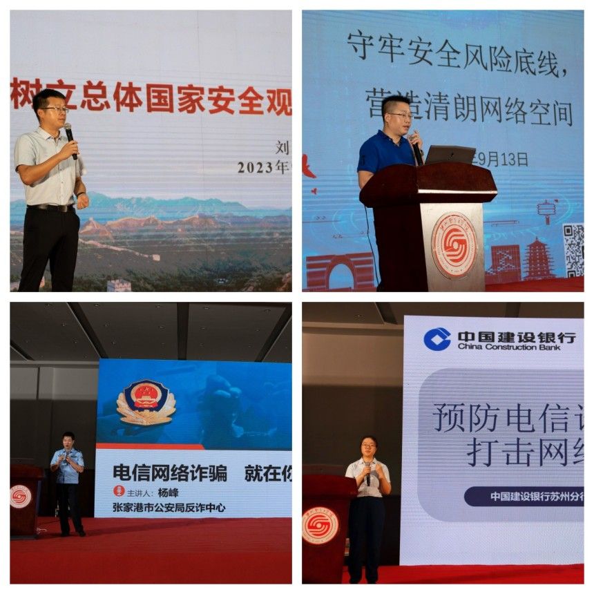 9月13日晚,由学院党委院长办公室副主任刘勇、苏州市委党校法律文化教研室讲师甘平、张家港市公安局刑警大队副中队长杨峰和建设银行苏州分行经理缪依洋,分别围绕总体国家安全观、网络安全和校园安全等主题进行讲解。刘勇主任向同学们阐述了树立总体国家安全观的重要性,让同学们对安全有了全新的认识。甘平老师教育大家要关注意识形态,学会明辨是非,厚植家国情怀,增强文化自信,营造清朗网络空间。杨峰队长和缪依洋经理,通过生动的案例,从不同的视角帮助学生提高谨防电信网络诈骗的能力。