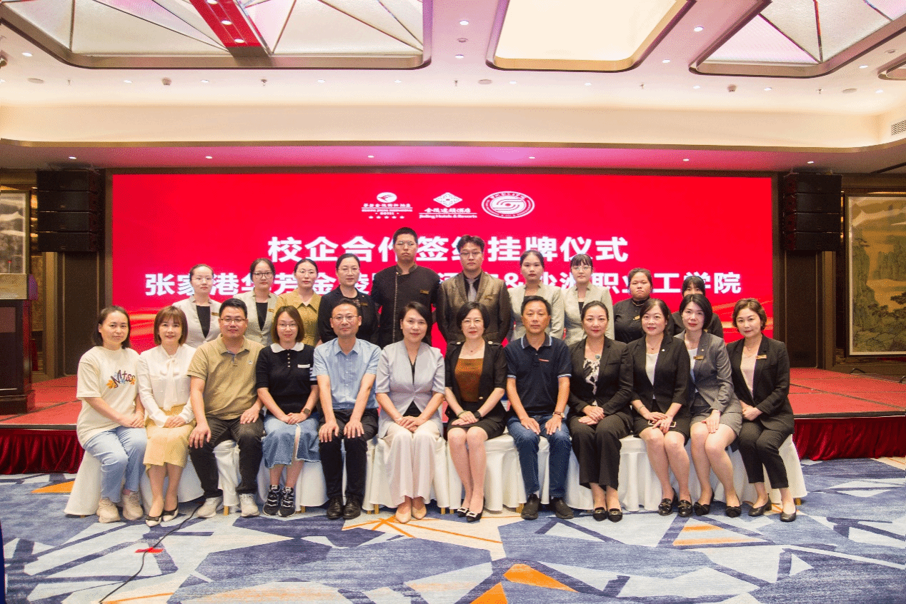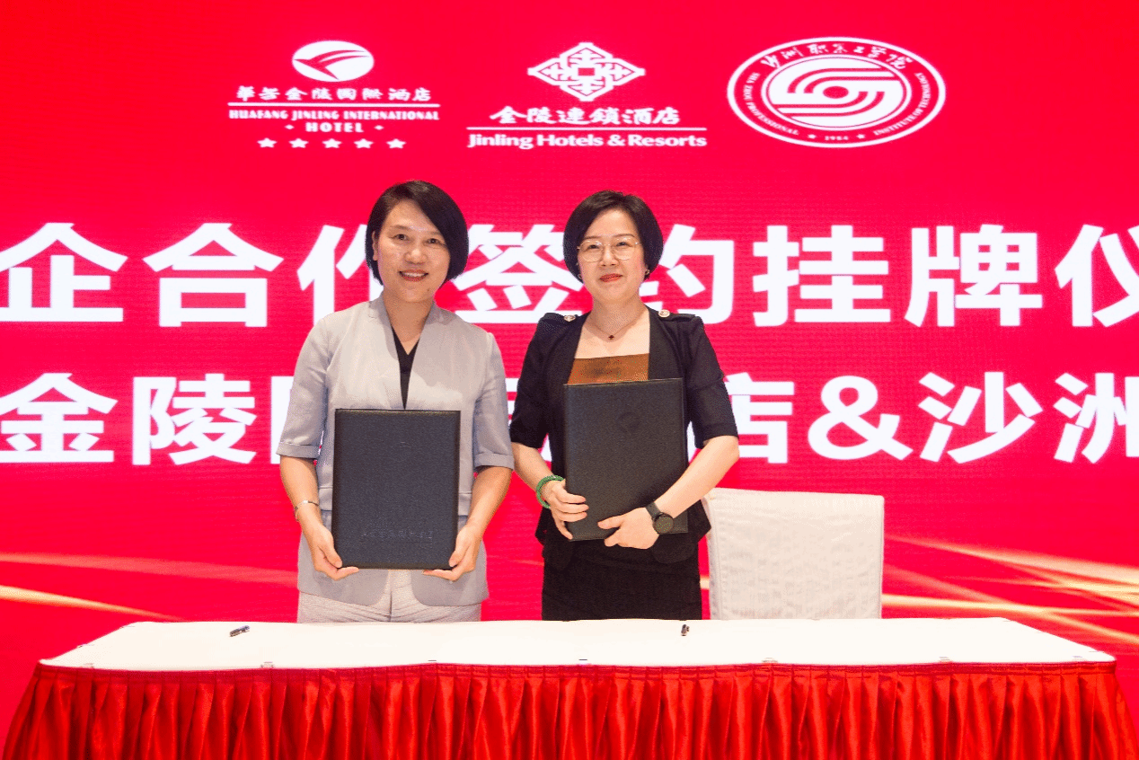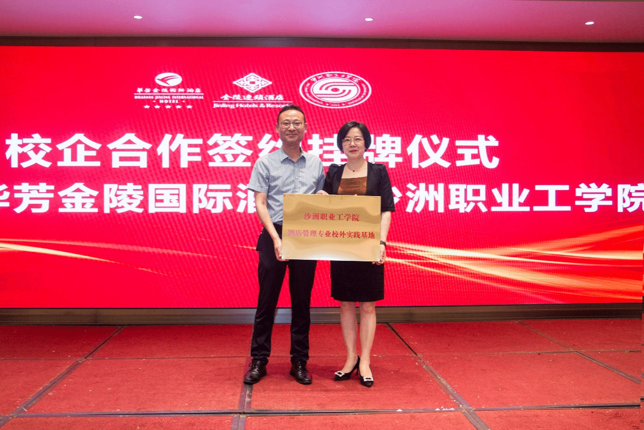 签约仪式上,陈海英与华芳集团副总、华芳金陵国际酒店总经理张燕共同签署“酒店管理专业校企合作订单培养”协议;张燕向优秀学生代表颁发了奖助学金;经济管理学院负责人与张燕共同为“沙洲职业工学院酒店管理专业校外实践基地”挂牌。
