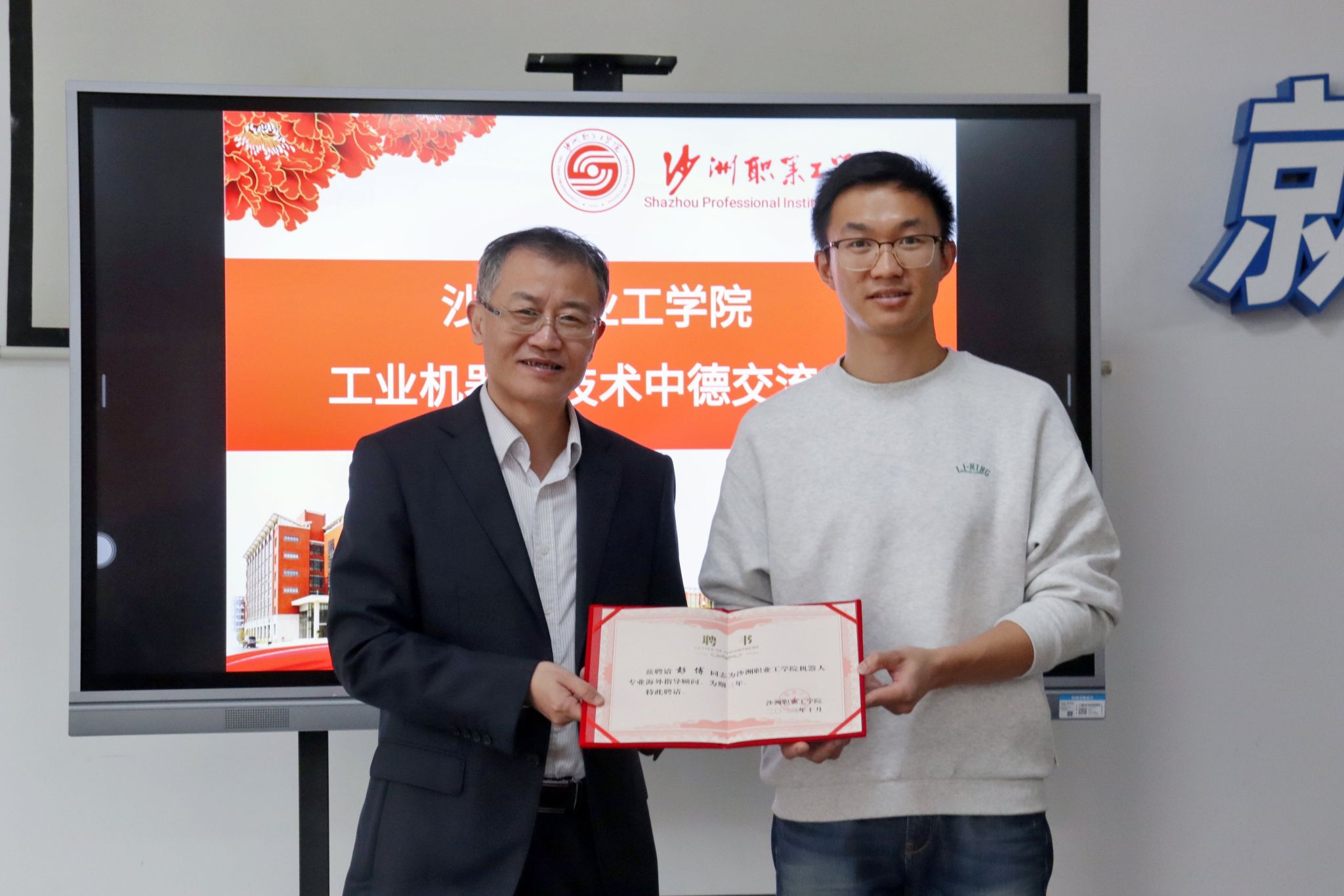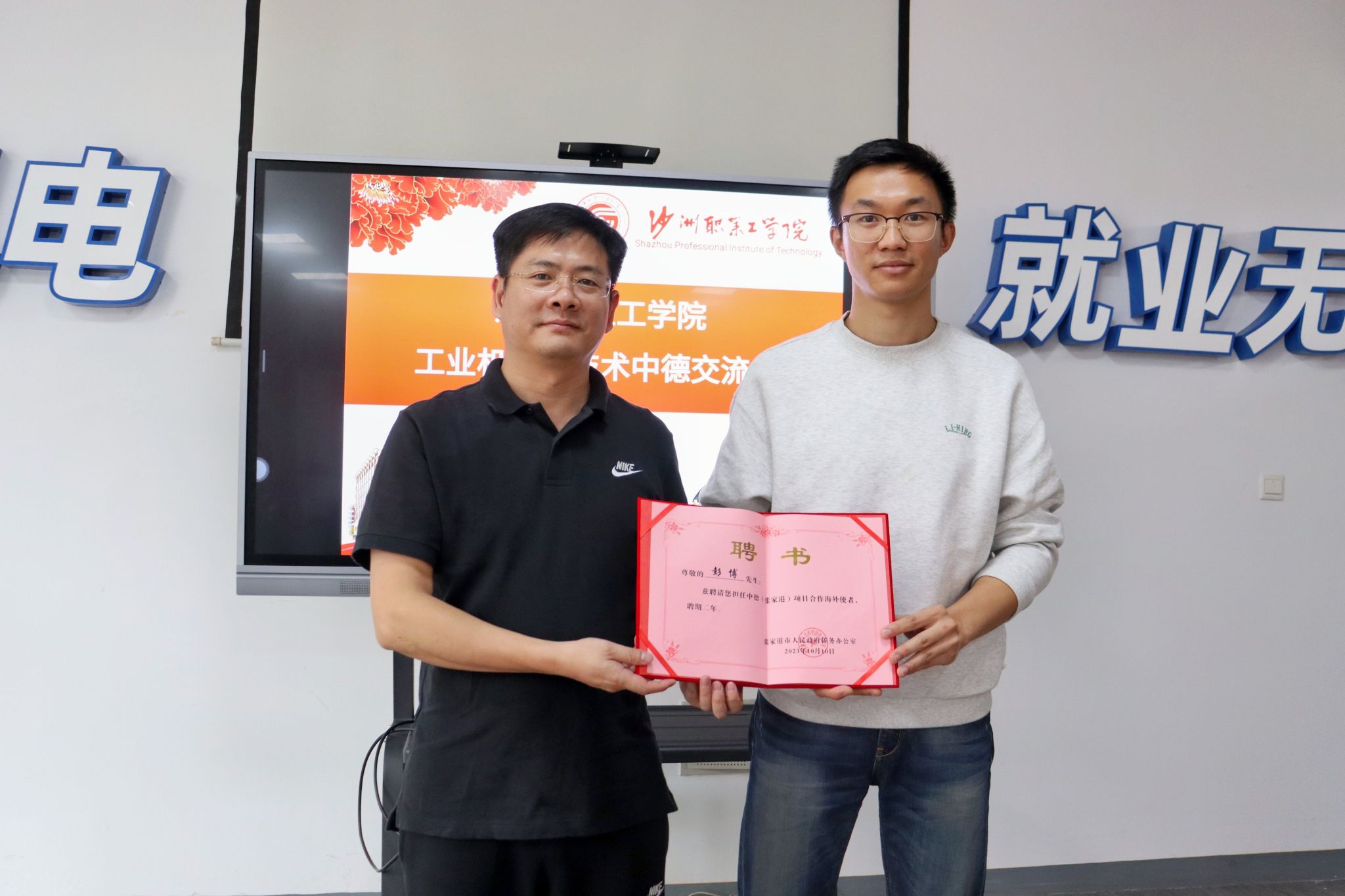 周晓敏为彭博经理颁发了“中德(张家港)项目合作海外使者”聘书,希望能以此次中德合作为契机,更好更快的将国外先进的智能制造技术引进到张家港,为张家港的产业和院校服务。刘俭为彭博经理颁发了“沙洲职业工学院机器人专业海外指导顾问”聘书,希望智能制造学院以机器人专业合作为起点,在专业建设、科技研发、资源开发等方面开展更多富有成效的深入合作。