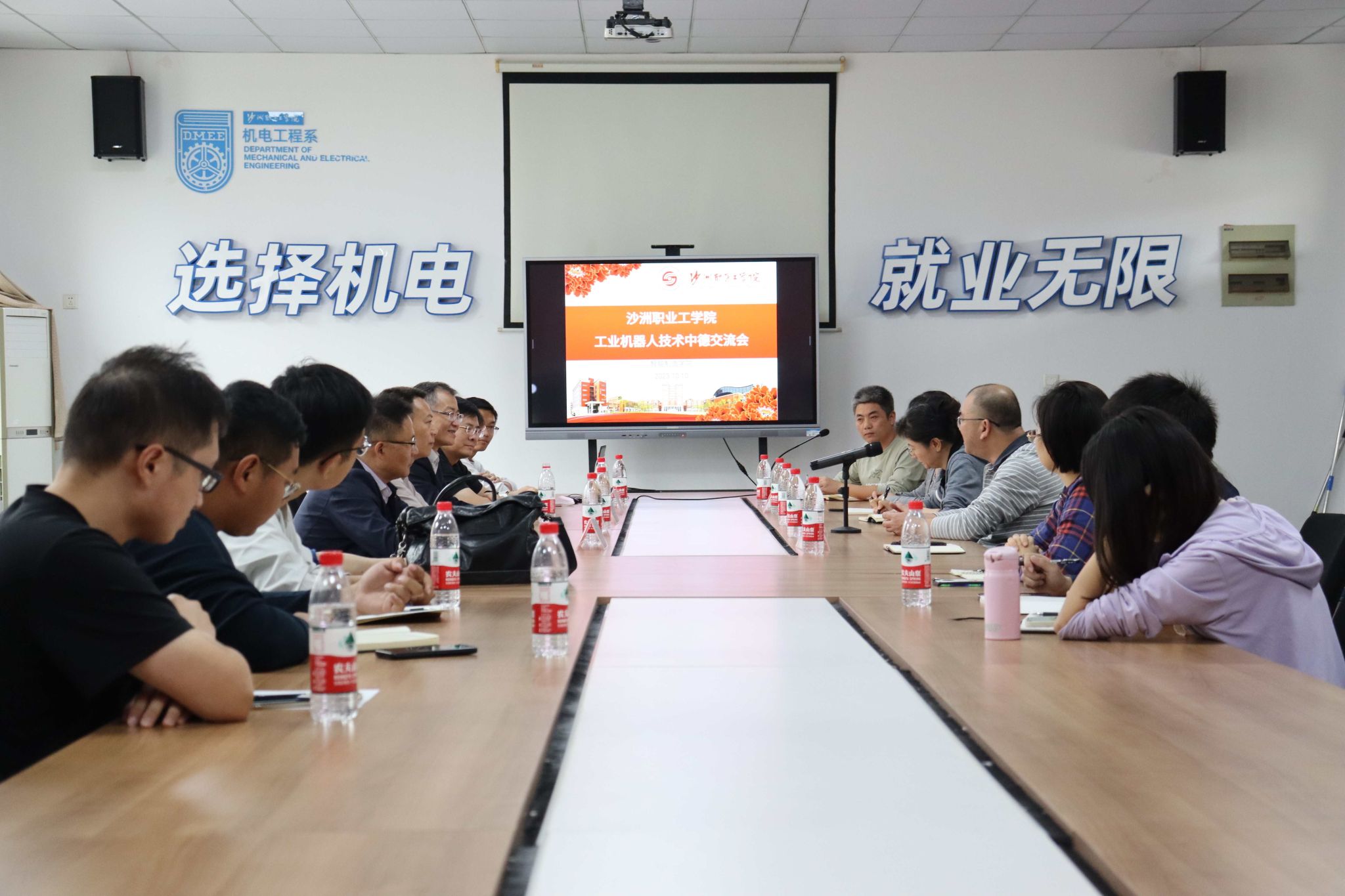 10月10日上午,中德工业机器人技术交流会在智能制造学院会议室举行,参加此次会议的有德国China Window国际信息技术合作公司彭博经理,张家港市委统战部副部长、市侨办副主任、市侨联副主席周晓敏,侨务科陶明玉,沙洲职业工学院党委委员、副院长刘俭,相关部门负责人,以及智能制造学院相关教师,会议由智能制造学院副院长阮殿旭主持。