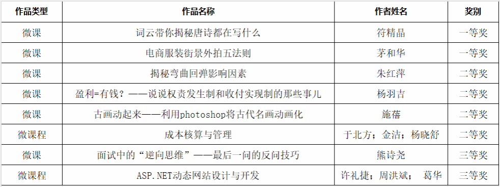 近日,江苏省高等学校教育信息化研究会发布《2023年江苏省高校微课教学比赛获奖名单公示》,经专家在线评审和会议复核,我校报送的8件作品全部获奖,获奖率达100%,取得优异成绩!其中,一等奖2名,分别是符精晶老师的《词云带你揭秘唐诗都在写什么》和茅和华老师的《电商服装街景外拍五法则》,二等奖4名,三等奖2名。