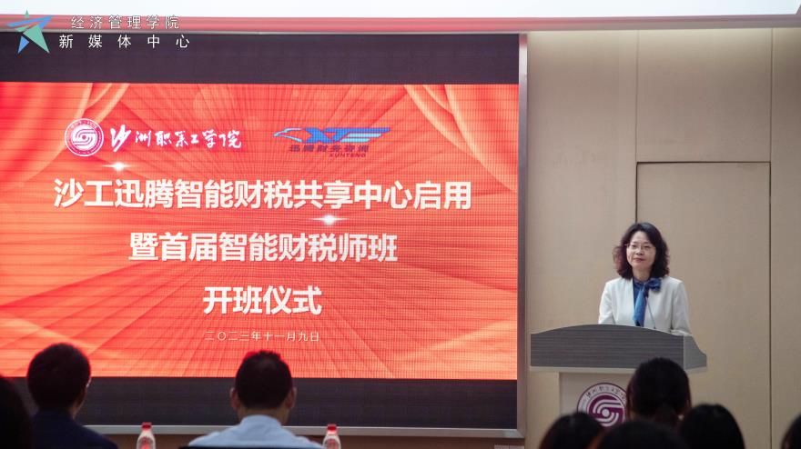 章雯和秦玉红共同为沙工迅腾智能财税共享中心揭牌,陈海英、张峰为企业导师颁发了聘书,经管学院负责人为首届智能财税师班校企班主任颁发了聘书,首届智能财税师班学校班主任与学生代表进行了发言。