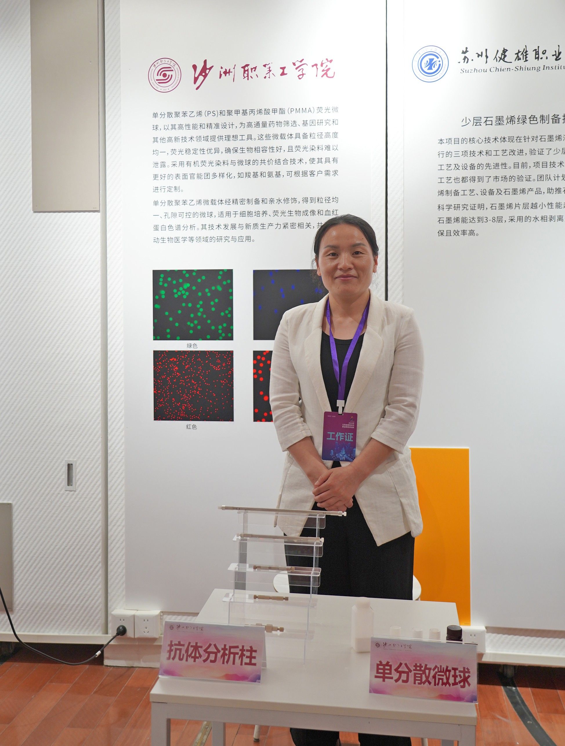 2024年江苏省暨苏州市职业教育活动周于5月16日在苏州工艺美术职业技术学院启动。我校单分散微球产品与抗体分析柱、牦牛绒纺织品、硅钢3D数字孪生系统和留青竹刻4项作品在活动周上进行展示。