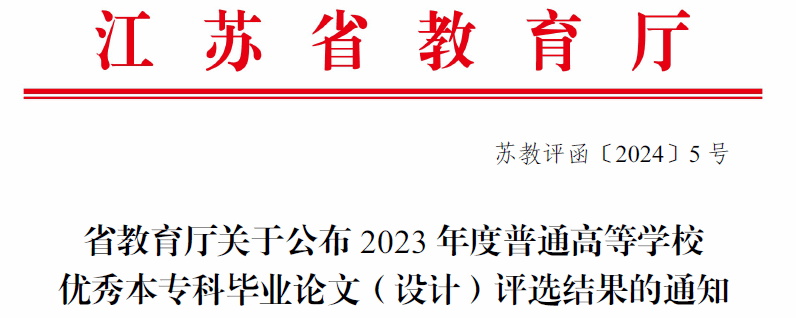 近期,江苏省教育厅公布2023年度普通高等学校优秀本专科毕业论文(设计)评定结果,我校费燕娜老师指导的毕业论文《壳聚糖纳米薄膜敷料的工艺开发及性能研究》荣获一等奖;贾苏和董袁泉老师指导的《基于深度学习的人脸识别考勤系统》、朱红萍和陈立威老师指导的《应急环境下便携式太阳能发电装置的设计》、殷大雷老师指导的《住宅室内空间布局适老化设计—以张家港东兴苑小区16幢301为例》3篇毕业论文(设计)荣获三等奖。