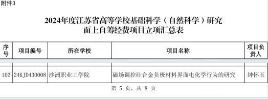 1、钟怀玉博士“磁场调控硅合金负极材料界面化学行为的研究”课题获批2024年度江苏省高等学校自然科学研究项目