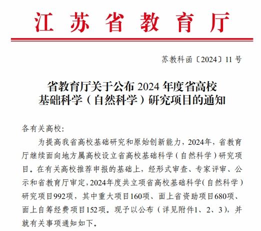 近日,江苏省教育厅发布了《2024年度江苏省高等学校基础科学(自然科学)研究项目拟立项名单公示》,我校钟怀玉博士申报的“磁场调控硅合金负极材料界面化学行为的研究”项目获批立项,这是我校近年来首次获批江苏省高等学校自然科学研究面上项目。