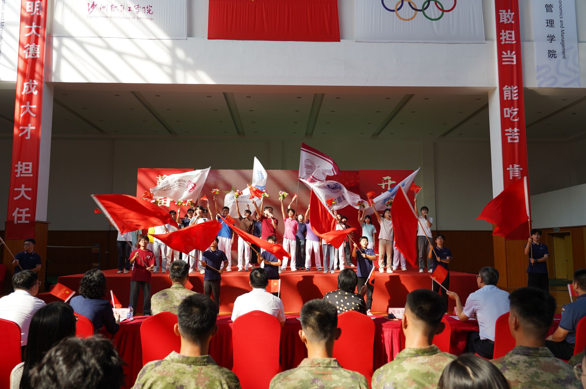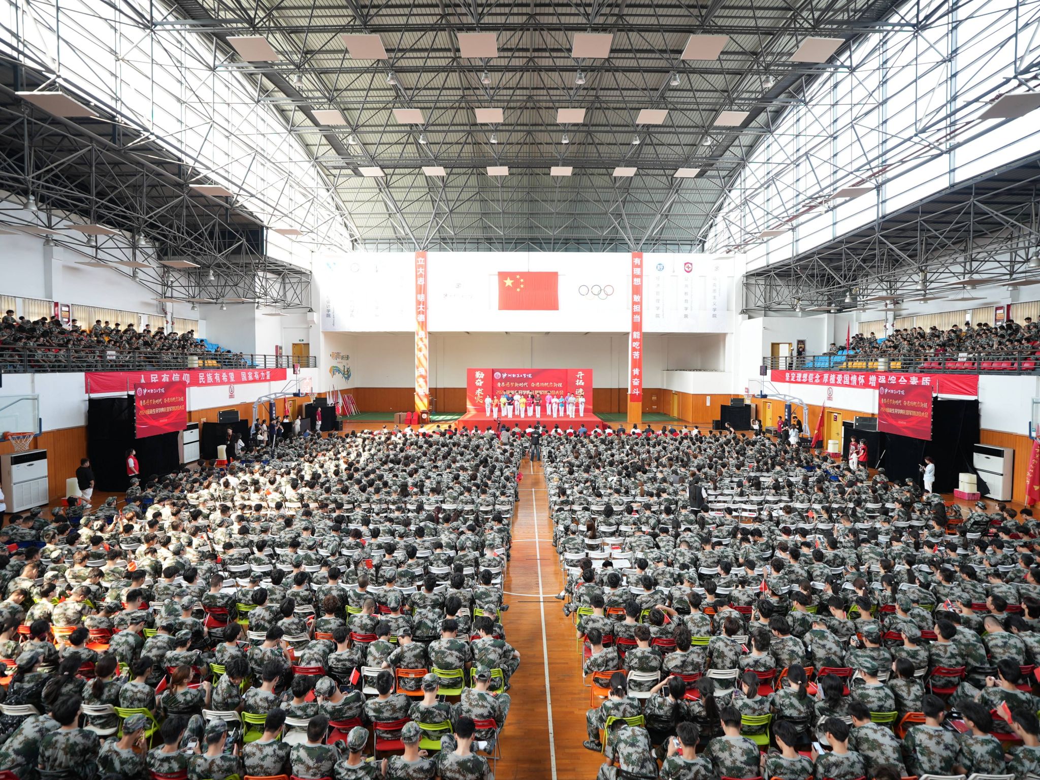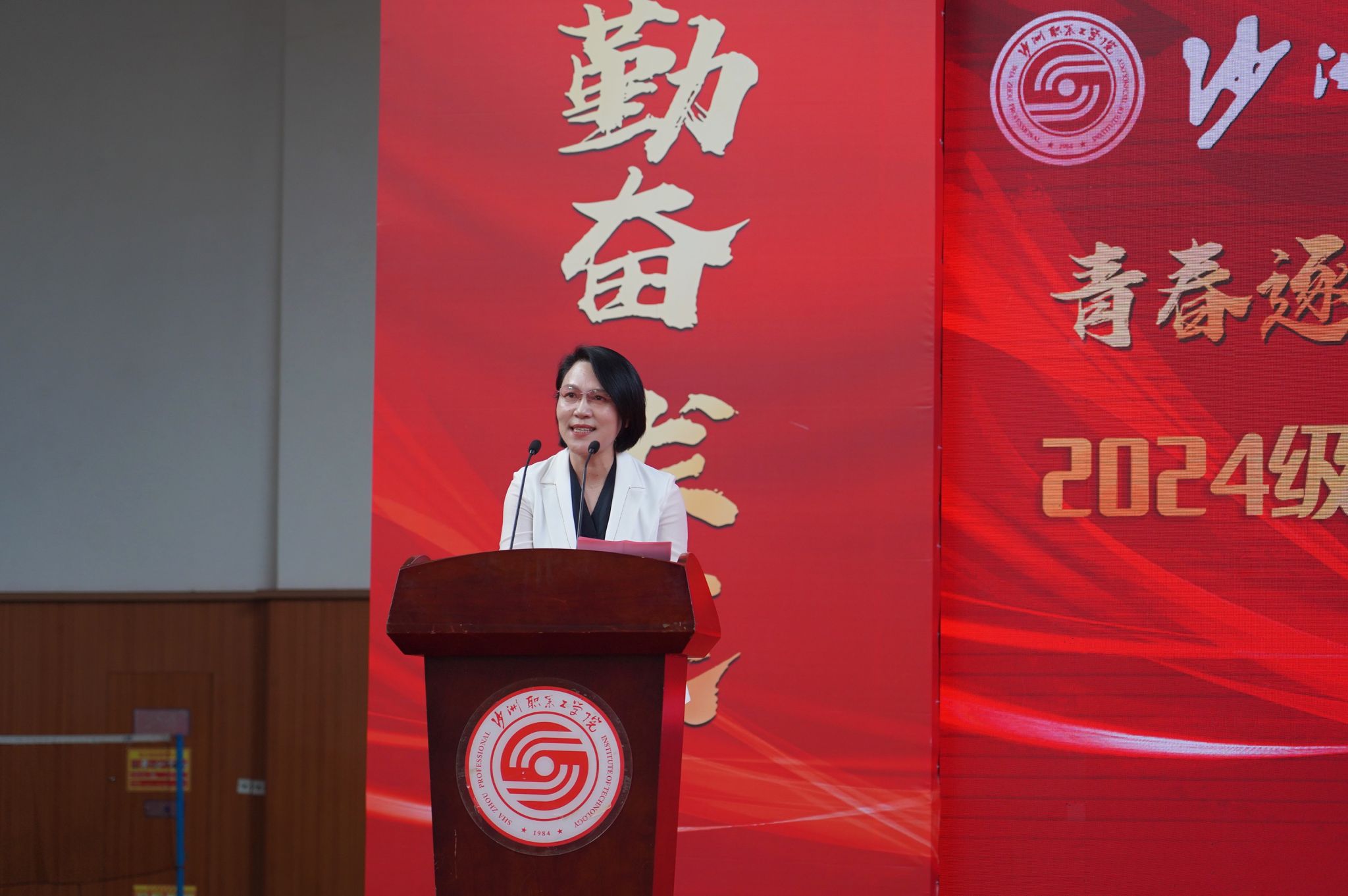 9月14日下午,我校2024级新生开学典礼暨军训动员大会在体育馆举行。校领导、各二级学院及行政部门负责人、承训部队官兵、新生班主任、辅导员及全体新生参会。党委委员、副院长陈海英主持大会。