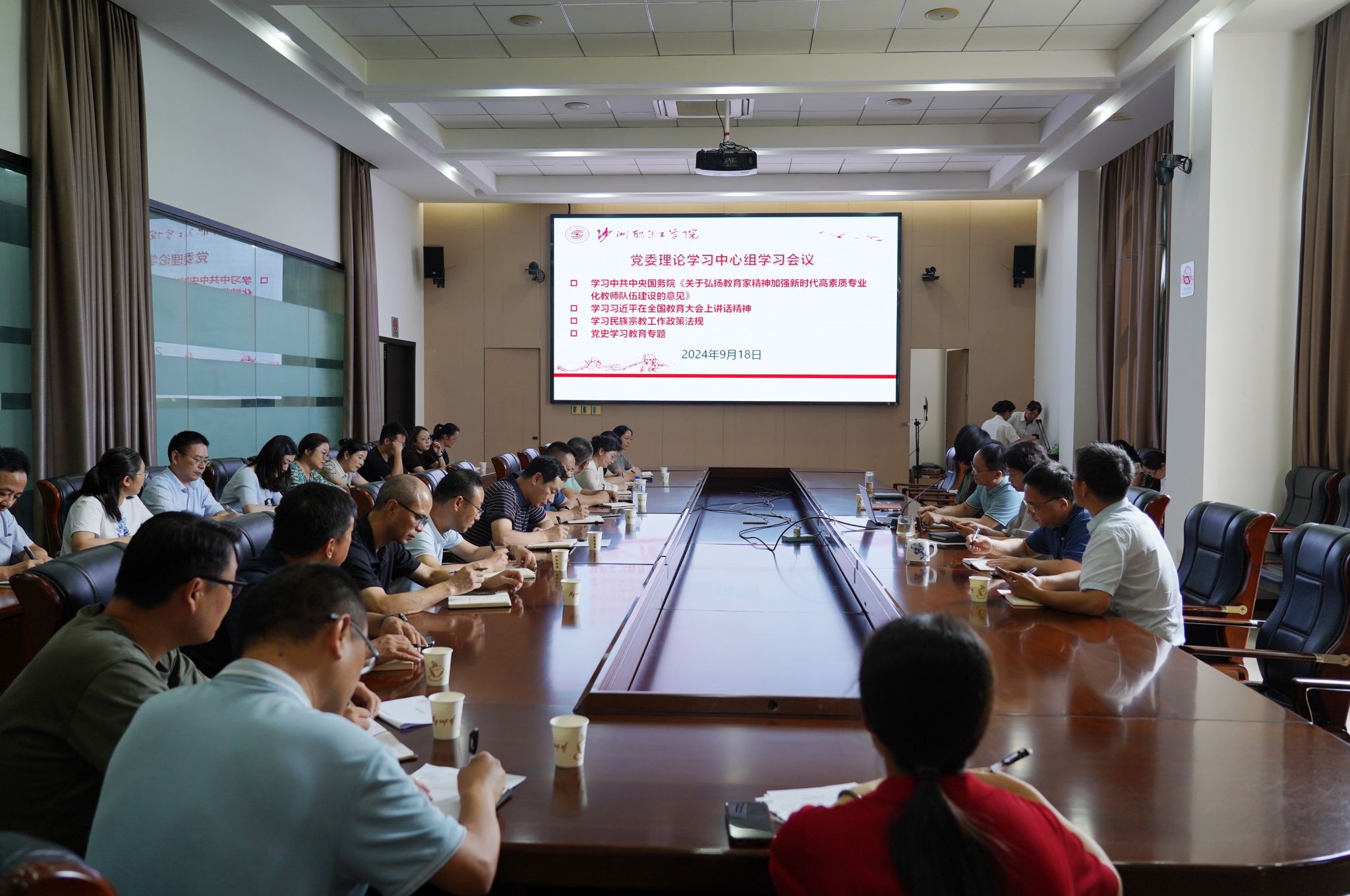 9月18日,学校在行政楼321会议室召开党委理论学习中心组学习会议,深入学习习近平总书记在全国教育大会上的重要讲话精神和全国教育大会精神,以及《关于弘扬教育家精神 加强新时代高素质专业化教师队伍建设的意见》文件精神。党委书记钱锦东主持会议并领学。