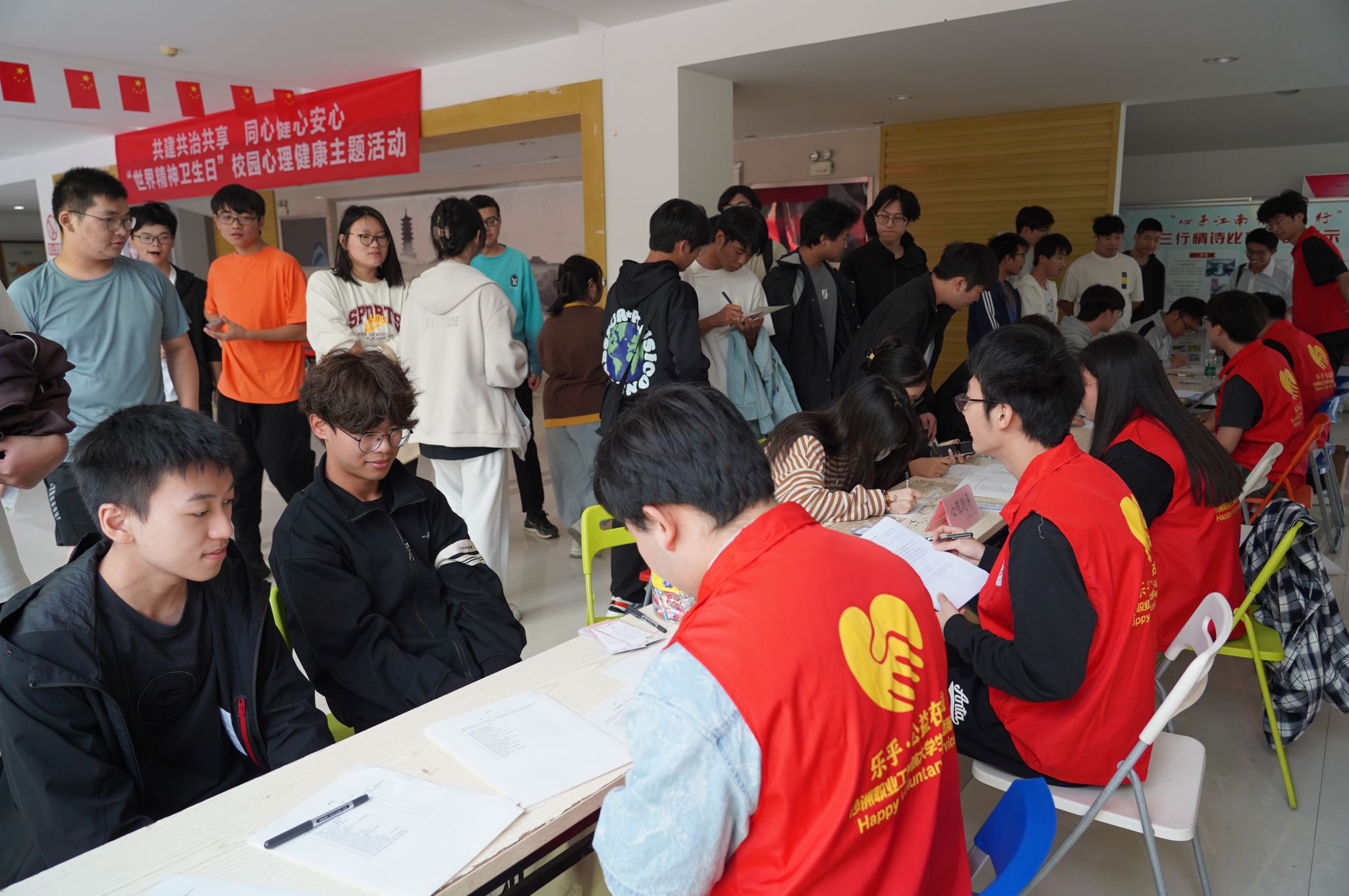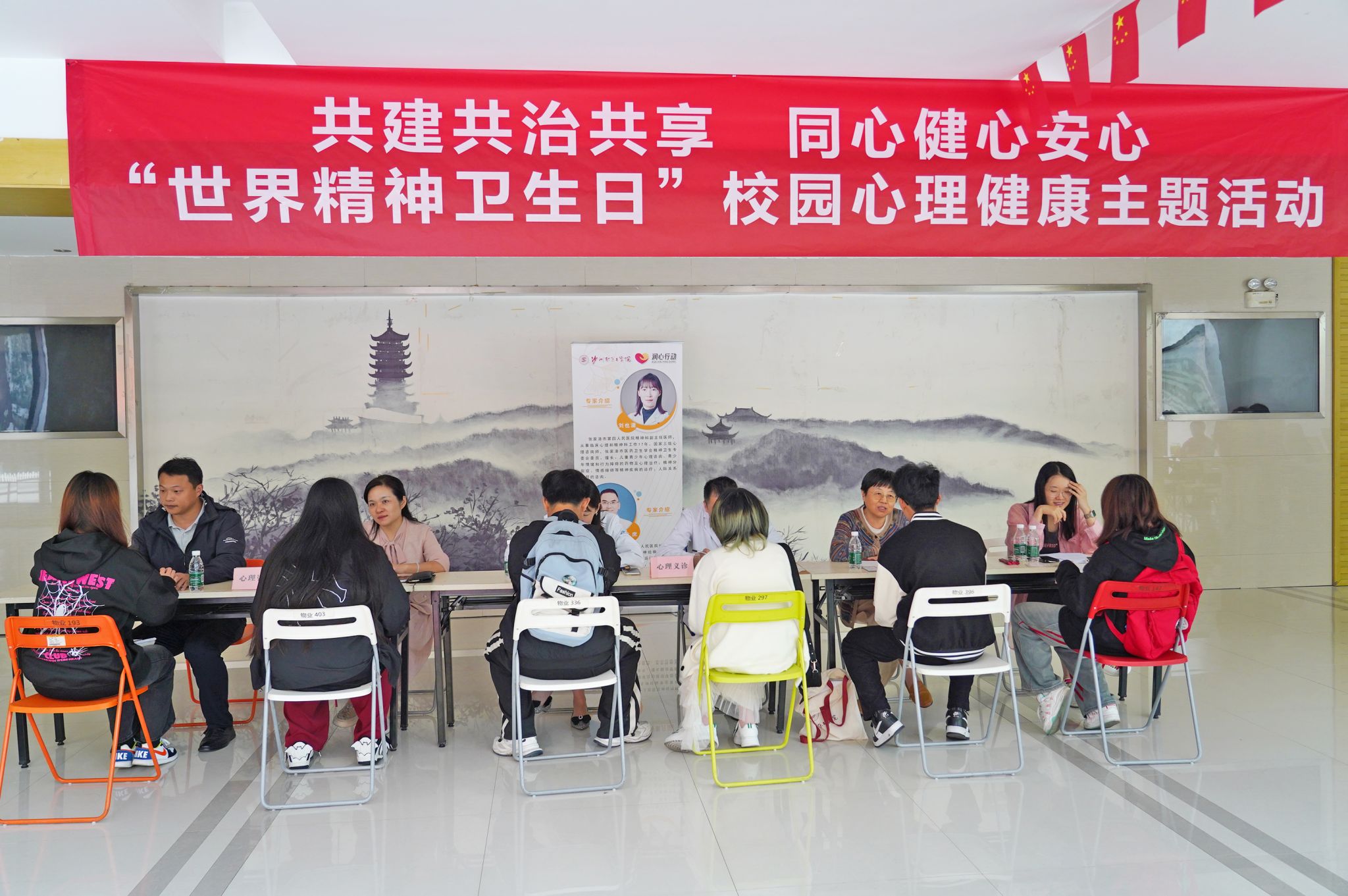 活动围绕本年度世界精神卫生日主题“共建共治共享,同心健心安心”,包括心理义诊、心理咨询、知识竞答、心理测验、情绪气球、烦恼留言箱等板块内容,学生积极参与,在活动中增进了精神卫生知识,倾诉了心声,释放了烦恼和压力。
