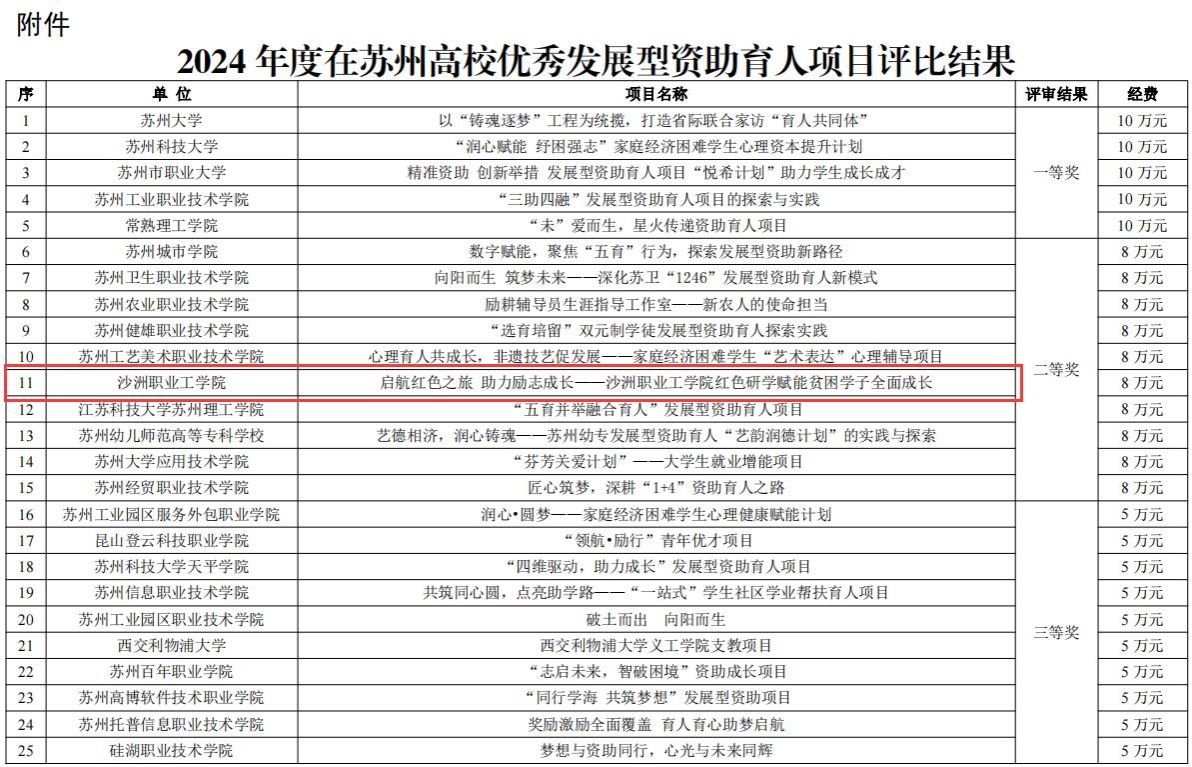 在苏高校优秀资助育人项目由苏州市教育局组织,旨在全面推进精准资助和资助育人,积极探索建立资助工作“项目化运作、专业化服务、规范化管理”模式,评比活动设一等奖5个,二等奖10个,三等奖10个。