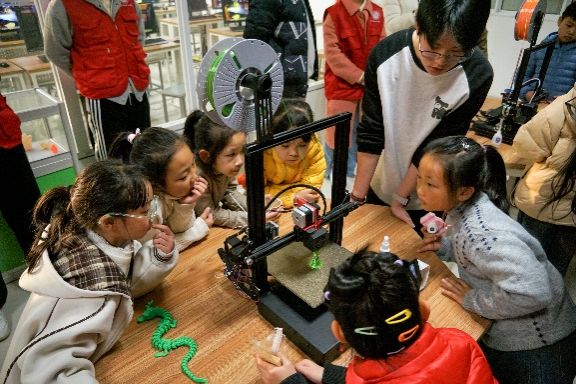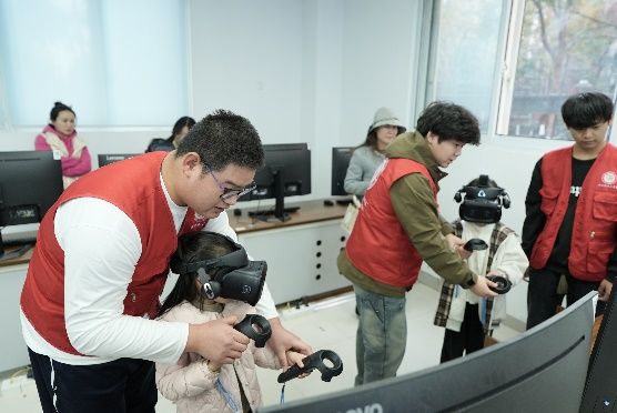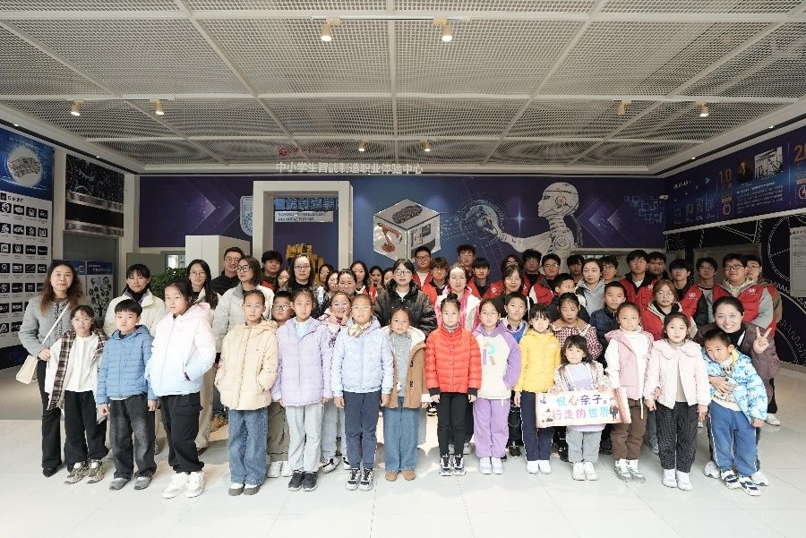 在参观的过程中,小朋友们认真聆听,仔细观摩,对先进的专业教学设施、实训设备产生了极大的好奇和兴趣。听完讲解后,在志愿者们的指导下,小朋友们纷纷对各类设备进行体验和操作,比如使用VR设备体验操作机械臂装载轮胎、控制机械手臂完成对瓶盖的抓取和放置、设计并见证3D打印实物的诞生……通过这些操作,拓展了小朋友们对新兴产业的认知。