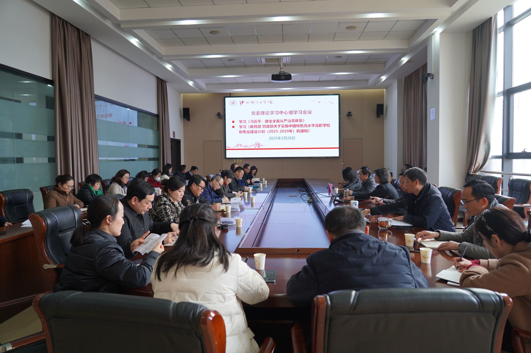 2月26日,学校在行政楼321会议室举行党委理论学习中心组学习会,专题学习习近平总书记重要文章《健全全面从严治党体系》和《教育部 财政部关于实施中国特色高水平高职学校和专业建设计划(2025-2029年)的通知》。党委书记钱锦东主持会议并领学。