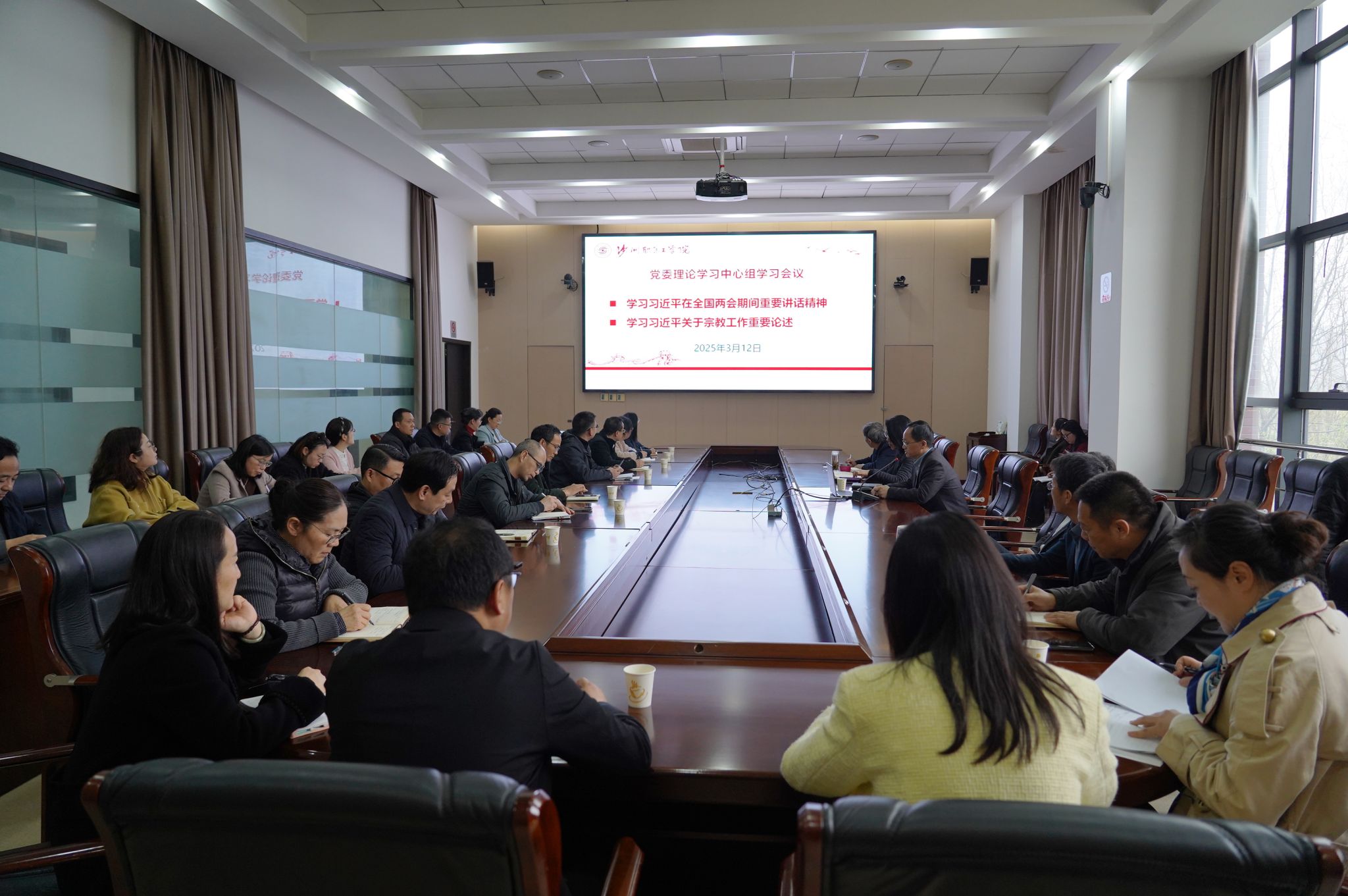 3月12日,学校在行政楼321会议室召开党委理论学习中心组学习会议,重点学习习近平总书记在全国两会期间的重要讲话精神和全国两会精神,党委书记钱锦东主持会议并讲话,党委理论学习中心组成员参加学习。