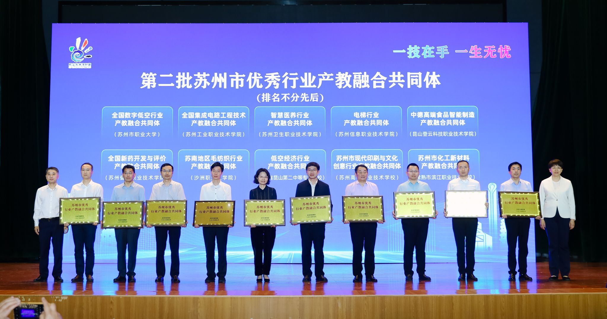 5月13日下午,以“一技在手,一生无忧”为主题的2025年苏州市职业教育活动周启动仪式在苏州市职业大学举行。来自苏州市教育局等九部门负责同志,各县级市(区)分管领导、教育行政部门主要负责同志,全市各职业(技工)院校党政主要负责人,在苏省级以上产教融合型企业代表、行业协会代表,媒体代表、师生代表、市民代表等近500人参加启动仪式。我校“基于AR/VR的数字化制造、中式台面的整套主题设计、传统手工编织壁挂艺术展、中国传统插花的传承与创新、非遗激光雕刻”5个项目参加了苏州职业教育办学成果“1+N”路演展示,“苏南地区毛纺织行业产教融合共同体”获评第二批苏州市优秀行业产教融合共同体。