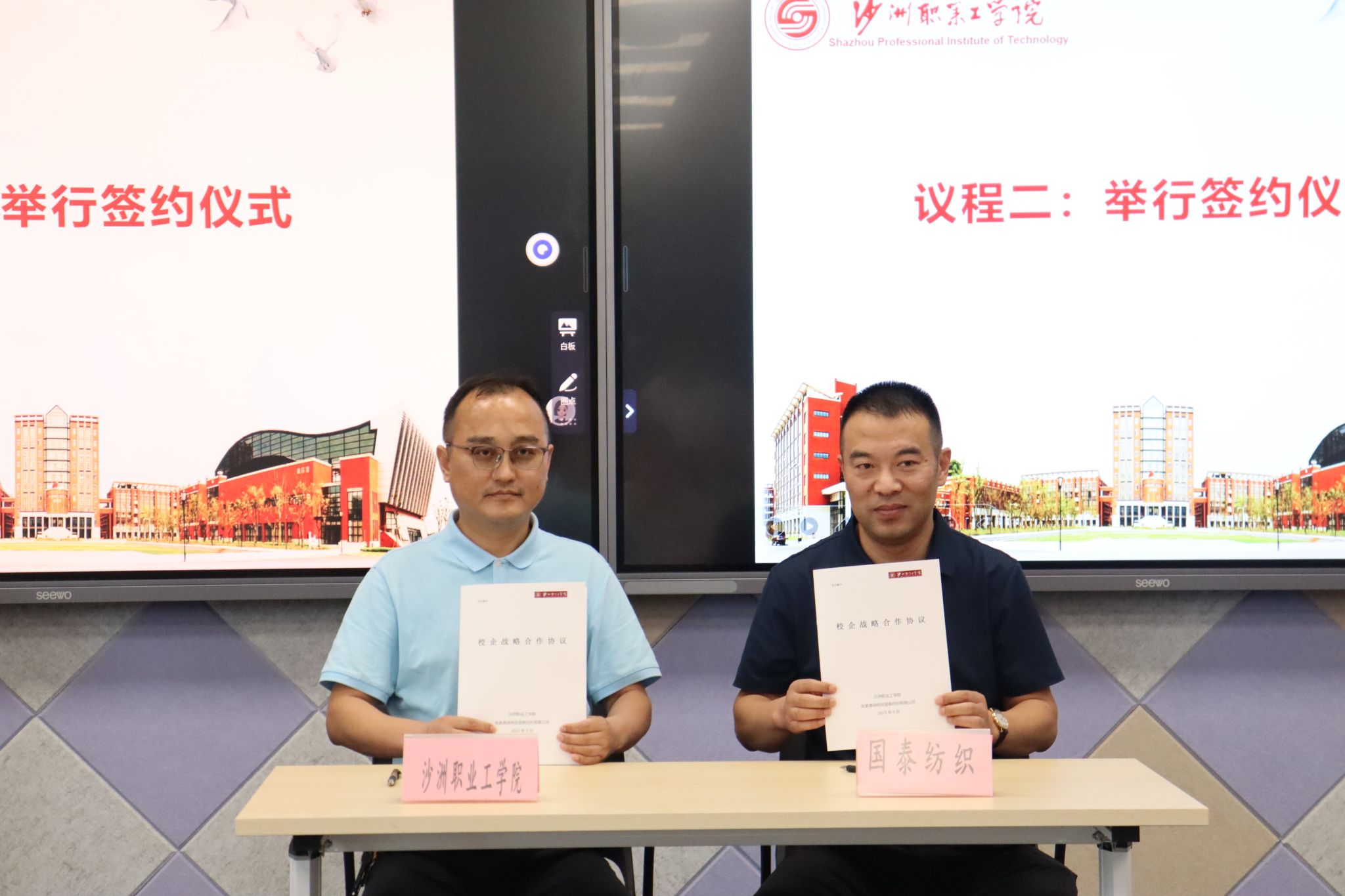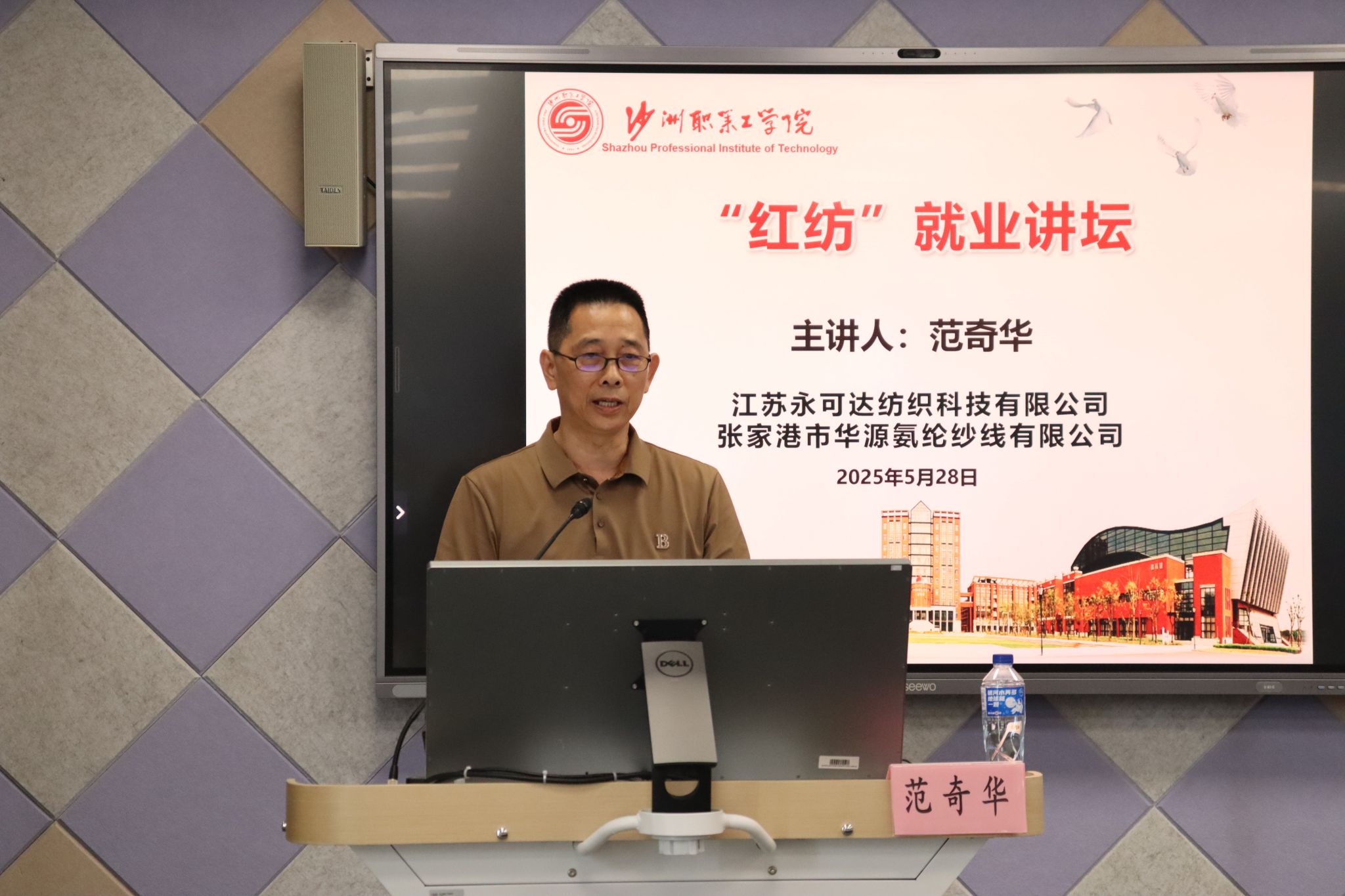 5月28日,校企战略合作成立仪式暨“红纺”就业讲坛在我校图书馆智慧教室举行。来自江苏永可达纺织科技有限公司、张家港市华源氨纶纱线有限公司、张家港市保税区国泰纺织有限公司的企业代表,校党委委员、副院长曹鹰飞,学校科研处、招就处、纺织服装与材料学院党政负责人及教师、学生代表参与了活动。