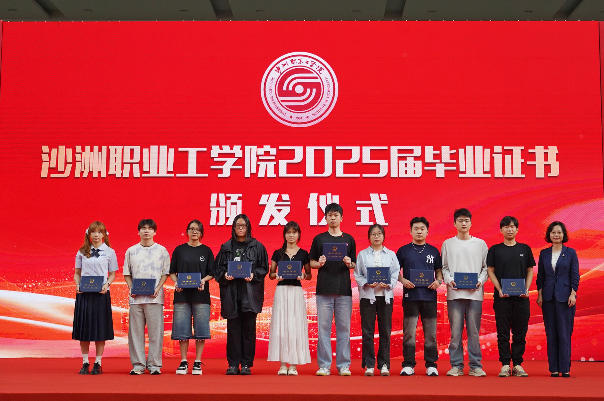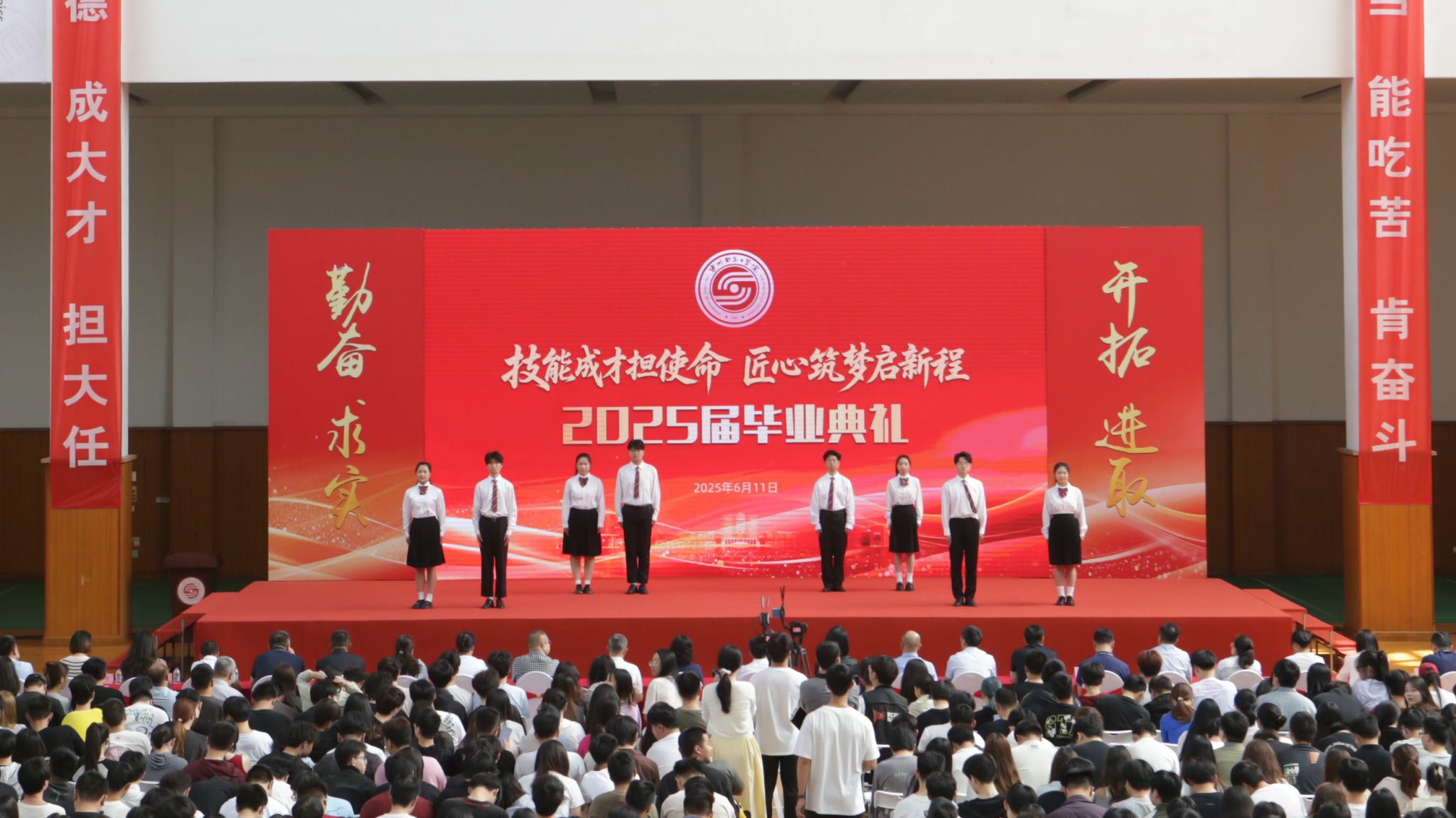 6月11日上午,我校在体育馆举行2025届毕业典礼。全体校领导,各部门、各二级学院负责人,教师、辅导员、校友代表、2025届毕业生参加了典礼。现场进行诗朗诵、播放毕业季特辑短片、校领导为毕业生颁发毕业证书、为“优秀毕业生”颁发荣誉证书、寄语毕业生,以及毕业生代表和教师代表交流发言、优秀校友分享求学、工作、创业经历等议程。典礼在师生代表的祝福歌曲《总有美好在路上》、《好相逢》中落下帷幕。