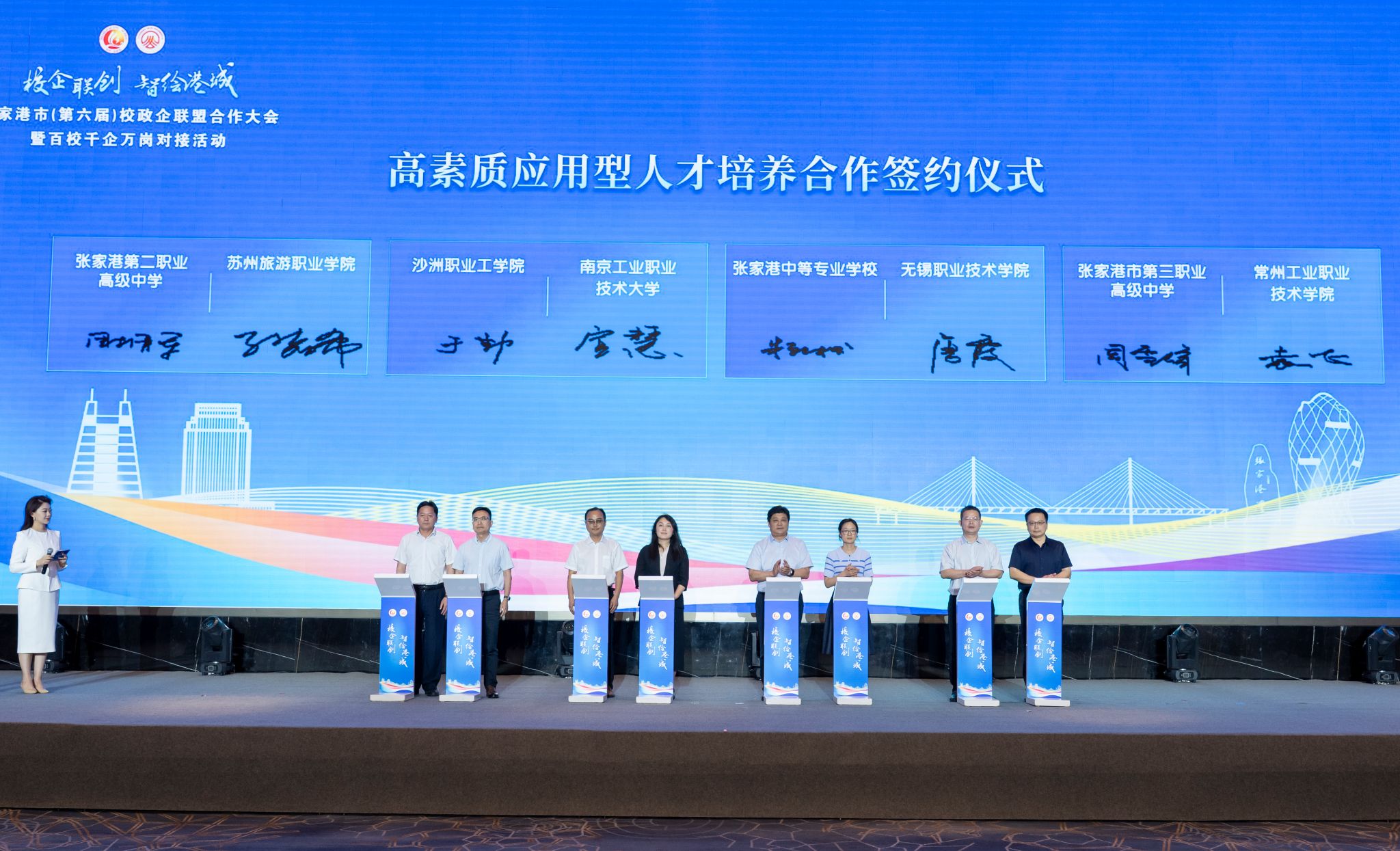 6月13日,我校参加了以“校企联创 智绘港城”为主题的2025年张家港市(第六届)校政企联盟合作大会。我校与南京工业职业技术大学签署战略合作协议,与江苏珂亦新能源科技有限公司签订订单班联合培养计划,接受张家港光束汽车有限公司捐赠的教学用车,参与“百校千企万岗”对接活动。我校还参与高素质应用型人才培育座谈会,与南京工业职业技术大学、苏州市职业大学等多所省内高水平高职本专科院校座谈,共商高职院校高质量发展和高素质应用型人才培养有效路径,为推动区域职业教育协同发展凝聚智慧力量。
