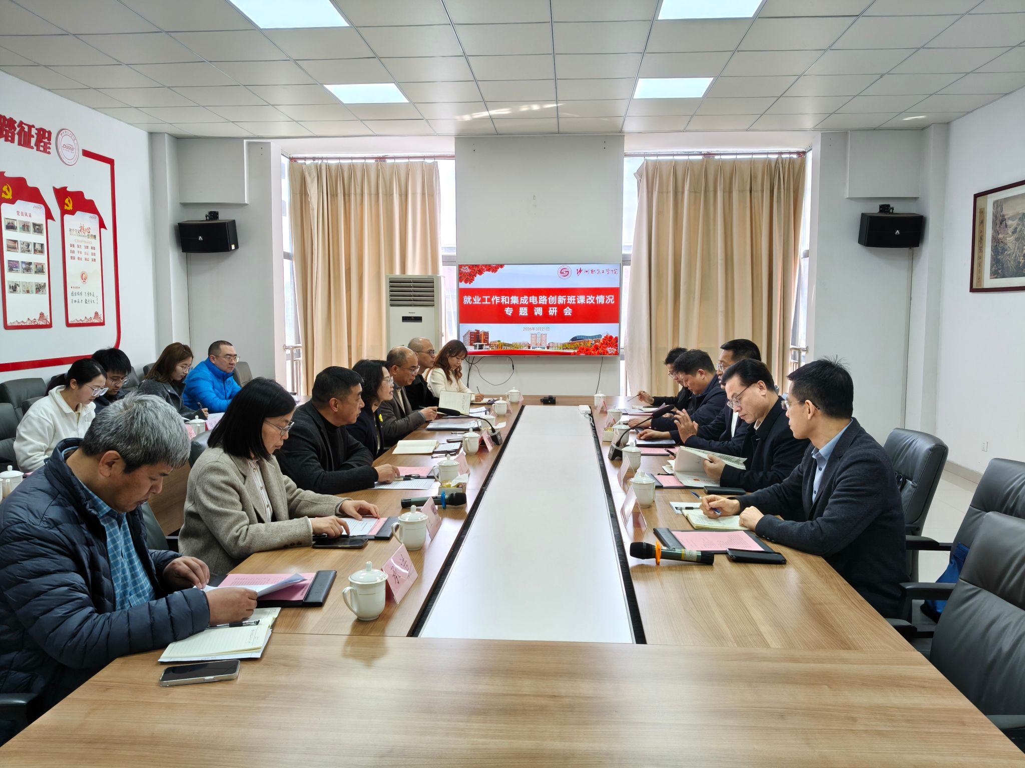 李炳龙一行认真听取了我校2025届毕业生就业工作情况和2026届就业工作推进举措的汇报,详细了解集成电路产教融合创新班的课程改革思路与阶段性成效。调研中,李炳龙对我校扎实开展“三服务”专项行动给予充分肯定,认为学校主动对接地方产业需求、精准服务项目企业园区的做法务实有效。他对创新班以“产业需求导向、校企协同开发、能力图谱牵引”的课改方向表示认可,并鼓励学校进一步深化产教融合,大胆探索课程能力图谱构建,推动人才培养与产业链紧密对接,为张家港集成电路产业发展输送更多高素质技术技能人才。