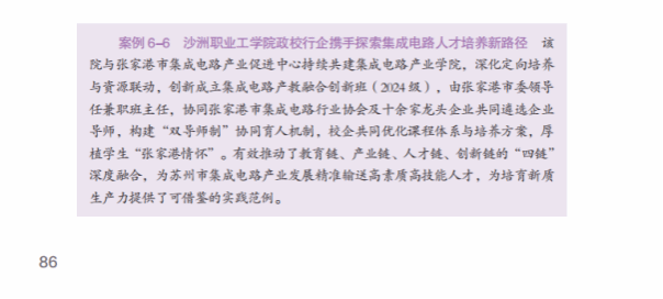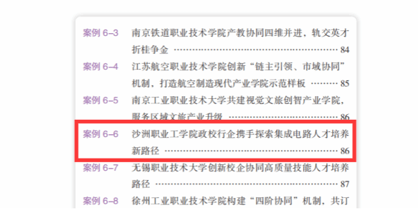 《沙洲职业工学院政校行企携手探索集成电路人才培养新路径》典型案例被收录在《江苏省高等职业教育质量报告(2025年度)》“产教融合”板块“机制创新”中 ,是培养新质生产力所需高技能人才的实践范例。