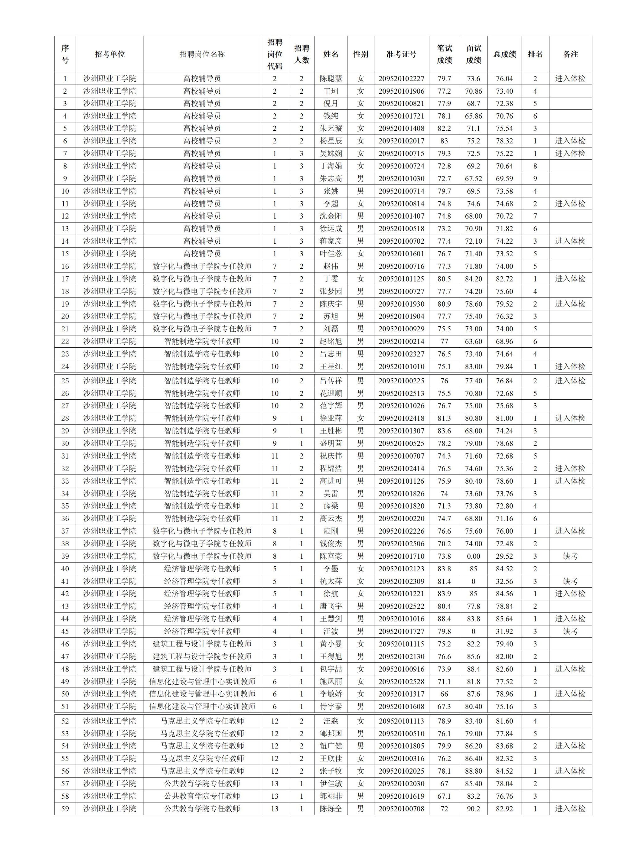 2024年沙洲职业工学院公开招聘工作人员面试考生总成绩公示