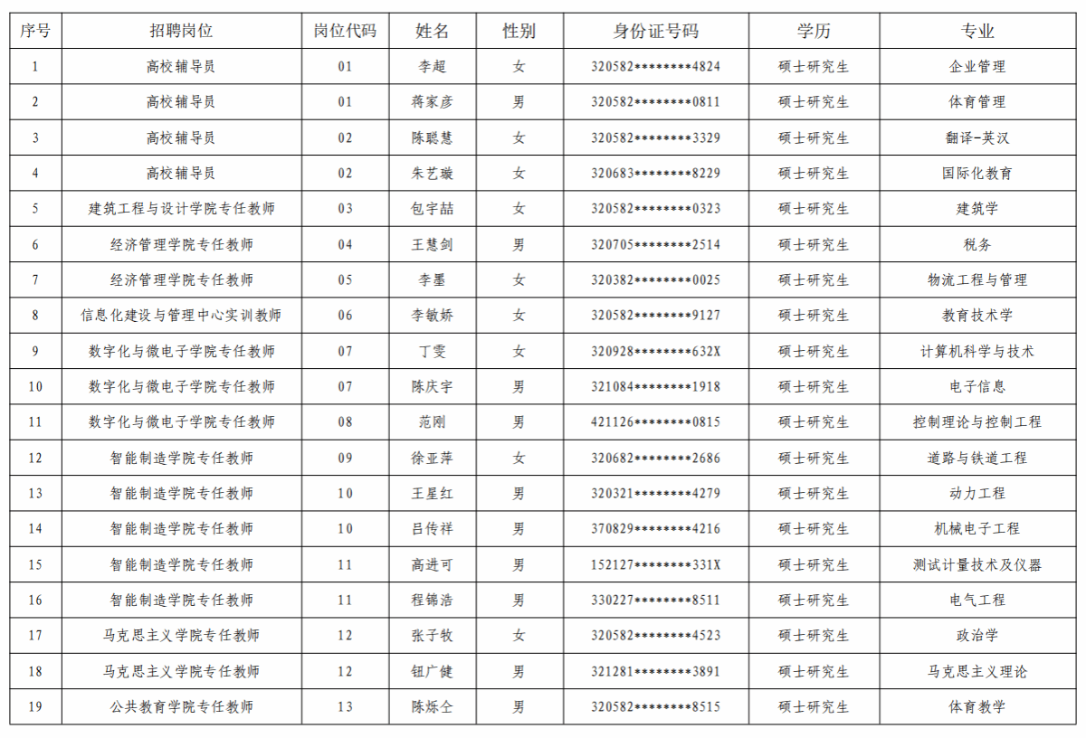 根据《2024年沙洲职业工学院公开招聘工作人员公告》,经笔试、面试、体检、考察(政审)等程序,现对以下拟录用人员予以公示。