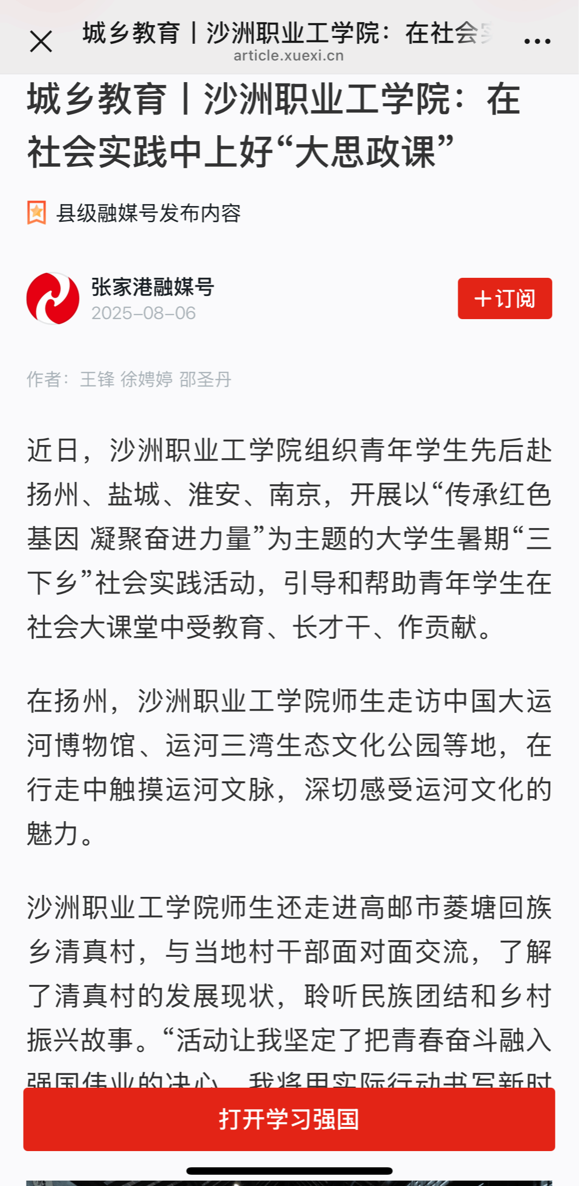 【学习强国】城乡教育丨沙洲职业工学院:在社会实践中上好“大思政课”