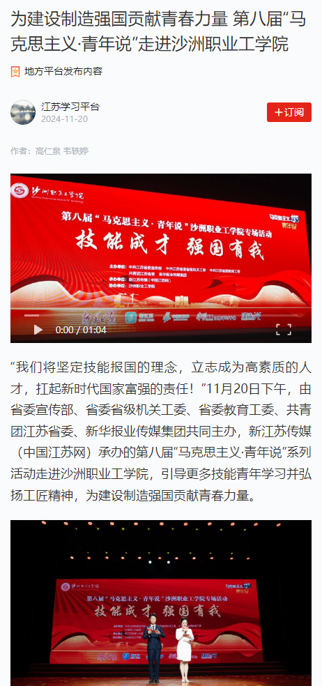 【学习强国】为建设制造强国贡献青春力量 第八届“马克思主义·青年说”走进沙洲职业工学院