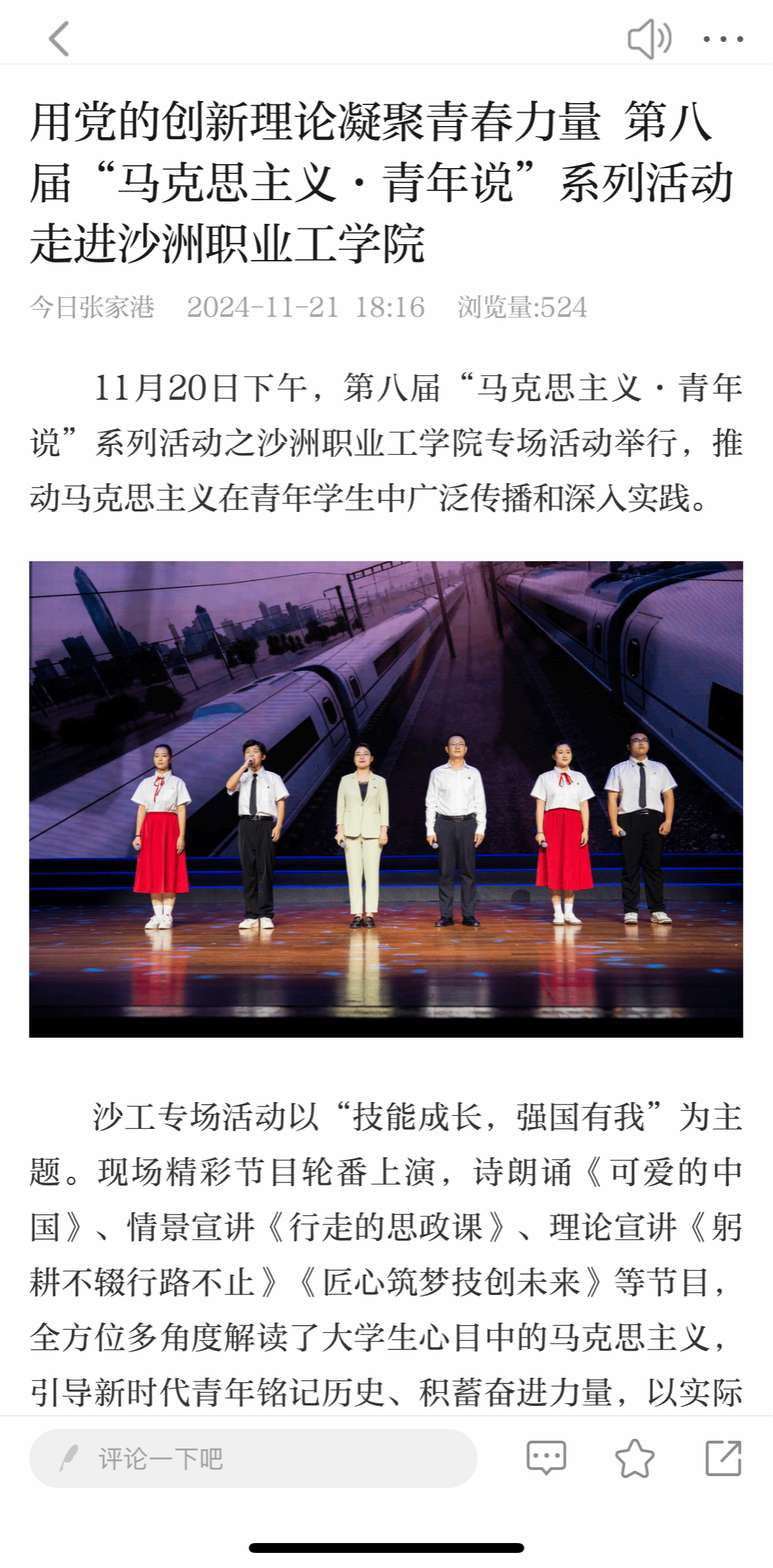 【今日张家港】用党的创新理论凝聚青春力量 第八届“马克思主义·青年说”系列活动走进沙洲职业工学院