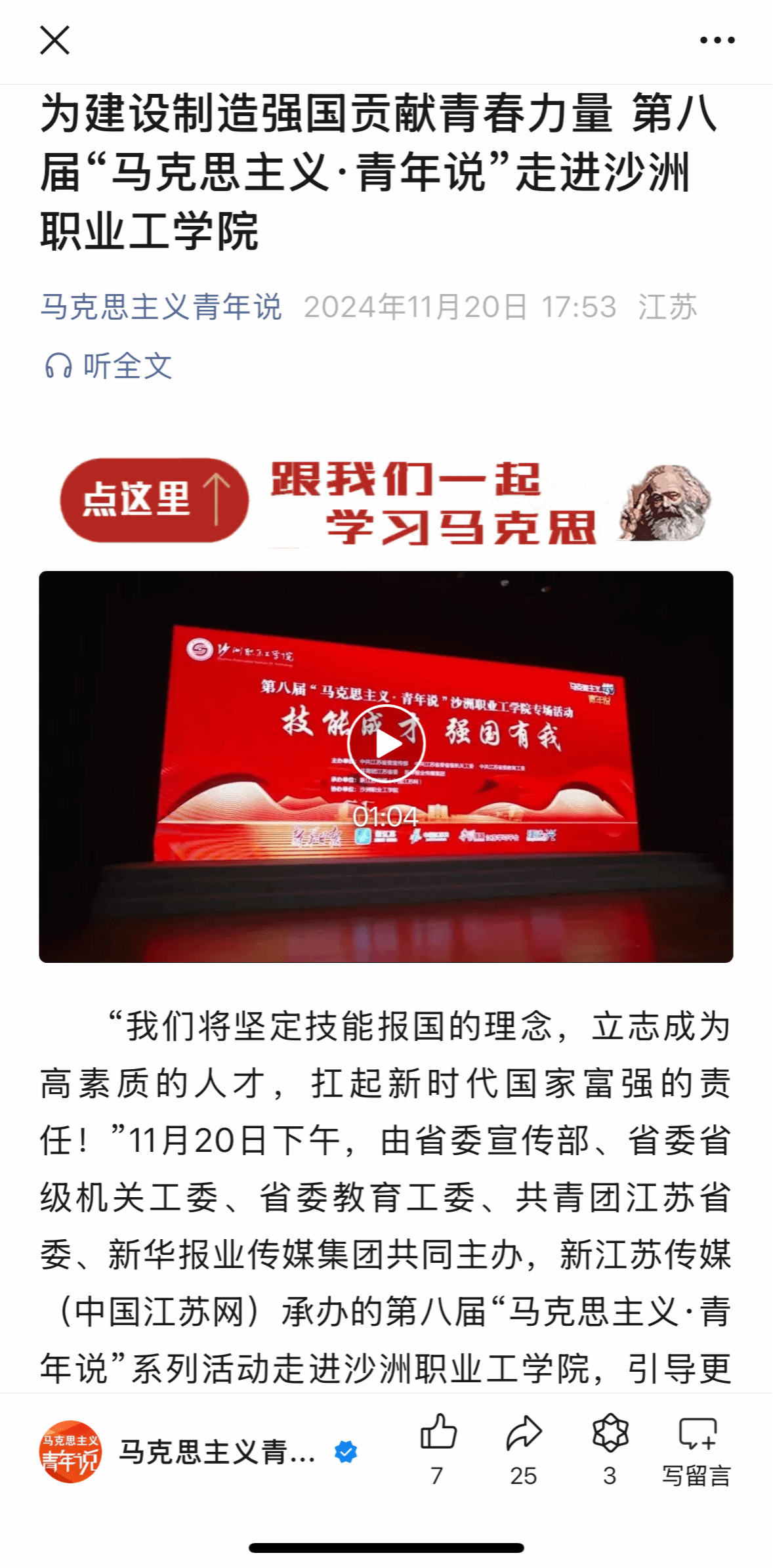 【马克思主义青年说】为建设制造强国贡献青春力量 第八届“马克思主义·青年说”走进沙洲职业工学院