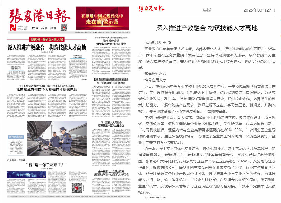 【张家港日报】深入推进产教融合 构筑技能人才高地