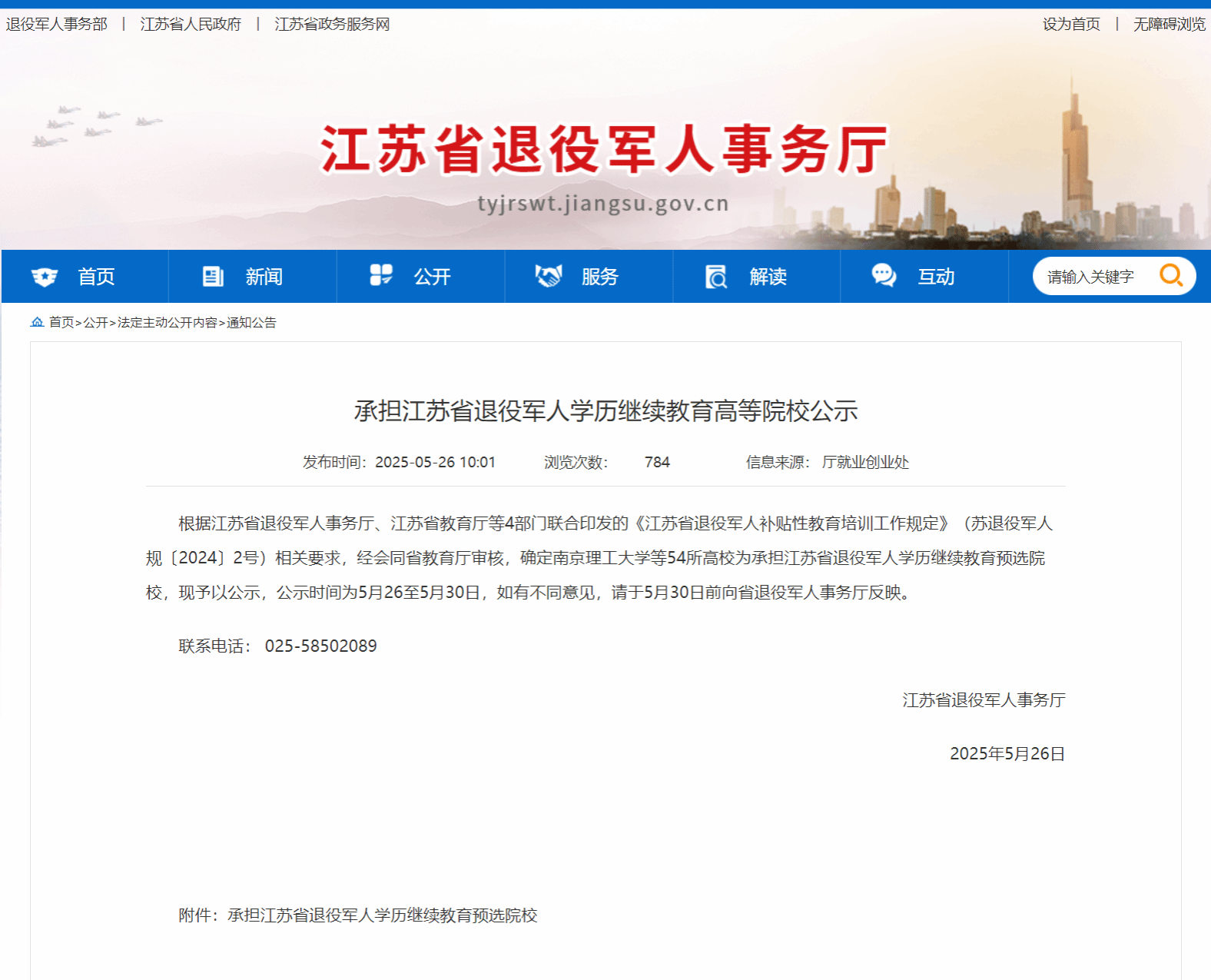 近日,江苏省退役军人事务厅官网公示54所江苏省退役军人学历继续教育预选院校名单,我校成功入选。