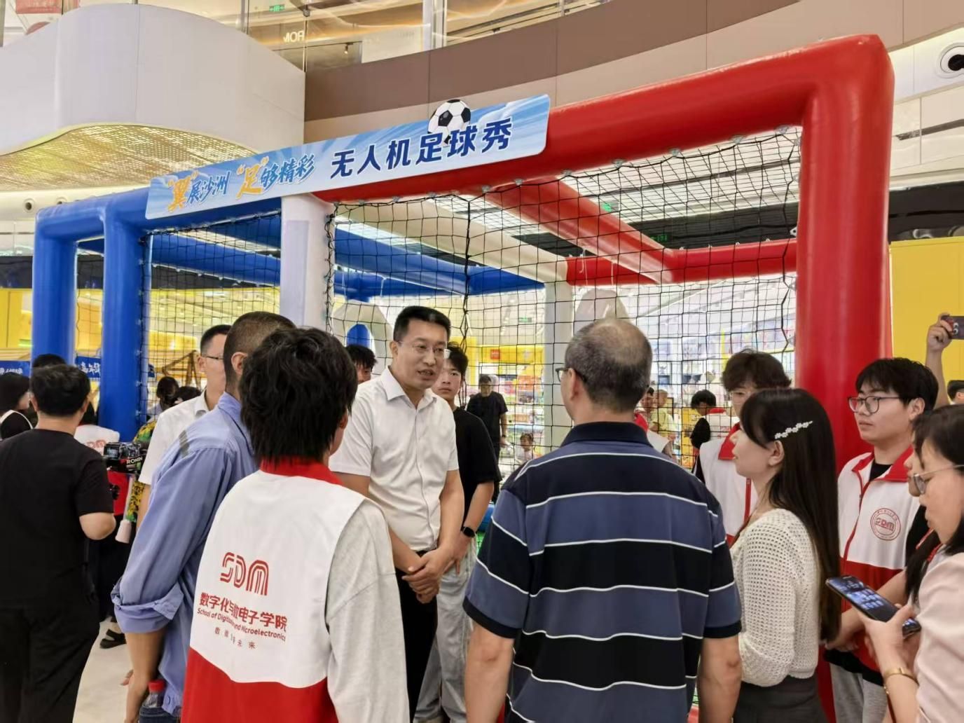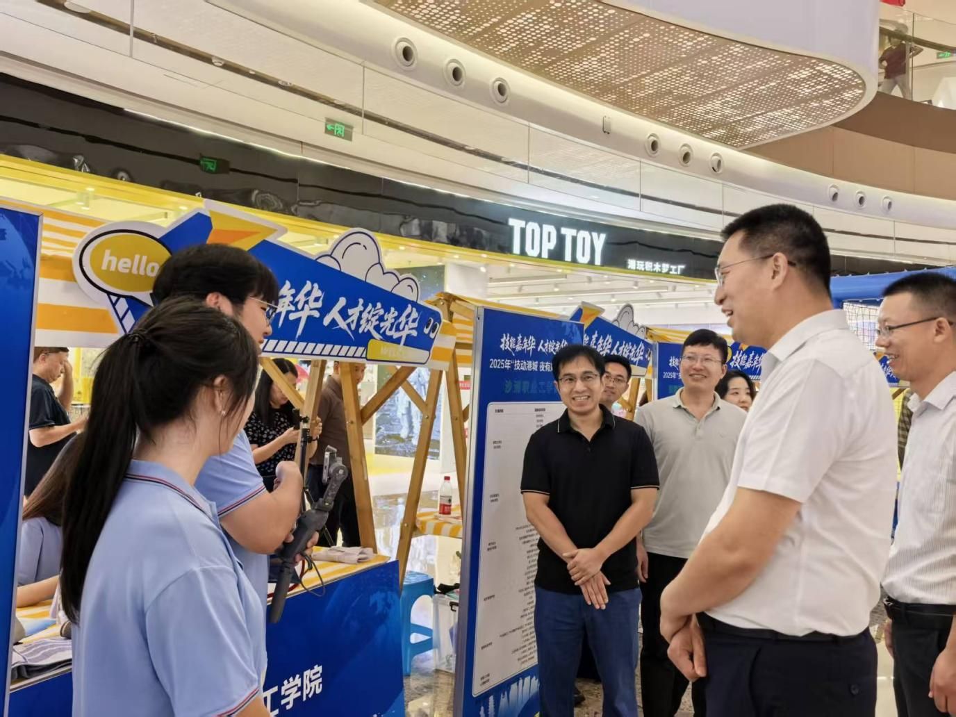 在“技动港城,夜有好市”活动现场,沙洲职业工学院的展台前人头攒动。智能制造学院的VR虚拟现实设备前市民沉浸式体验工业机器人运维场景;数字化微电子学院的无人机足球秀上机械 “运动员” 精准穿梭,大型无人机设备的展出吸引市民驻足观看;经济管理学院的电商直播平台,学生主播展示现场活动盛况。我校科技亮点展示内容丰富,成为活动现场焦点。市委常委、副市长李炳龙亲临现场,与我校师生开展互动。